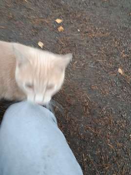 KUUSANKOSKI. Kymijoen rantareitillä Kuusaan puolella sillalta tehtaan suuntaan. Vaaleahko kissa. Ei kaulapantaa. Hyvinvoivan oloinen. Energinen ja ilmeisesti huomionkipeä.