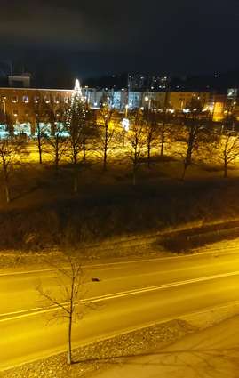 Espoonkeskus. Musta kissa käveli Espoonportin kadun yli Vieraskujalle päin klo 5.00. Kuva otettu parvekkeelta.
