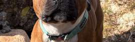Onkiniemi. Nuori punainen urosstaffi lähtenyt karkuteille mökiltä. Sininen Rukan panta kaulassa.