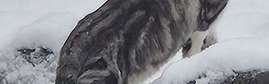 Selvästi kylmissään oleva harmaa-valkoinen kissa.…