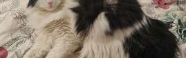 Nähty kaksi lemmikkikania, todennäköisesti hermeliinejä, Virrenkulmassa. Toinen vitivalkoinen toinen joko ruskea tai harmaa.