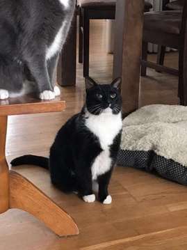 Kadonnut musta leikattu kollikissa. Valkea kaulus ja vatsa. Todella keltaiset silmät, valpas katse. Katoamishetkellä pullukka mutta terve.
