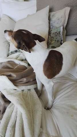 Pörheä, Tummanruskea/ruskea, säkä n.40cm, todella arka, mutta ei yhtään agressiivinen. Puolipystykorvat.