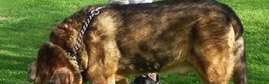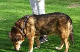 Suomenlapinkoira, selästä tumma, mutta tassuista, hännästä ja rintamuksesta vaalea. Mahd. tumman oranssi kaulapanta. Keskikokoinen, ei arista ihmisiä.