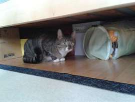 Kerrostalomme alaoveen on eilen laitettu ilmoitus: "Löytynyt harmaa rotukissa. Kissa on B-talon pyöräkellarissa."