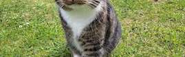 Hirsimäki, Riihimäki. Pieni harmaa kissa, jolla valkoinen täplä kaulan alla.