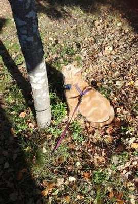 Karannut paikassa Rännänen punatabby leikattu uroskissa. Jalkojen välissä valkoinen alue. Katoamishetkellä päällä violetit valjaat ja sinikirjava kaulapanta, missä tunnistuslaatta. Myös vaaleanpunain…