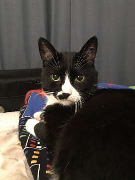 Mustavalkoinen hoikka kollipoika. Arka, pelkää koiria. Musta, valkoisia läikkiä esim. Rinnassa. Luultavasti seikkailee jossain päin kilpiäistä.
