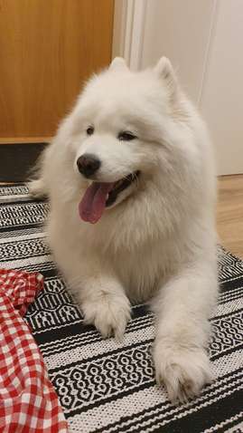 Varistosta löytynyt samojedinkoira harhailemasta. Ei kaulapantaa, käyttäytyi rauhallisesti ja otettu sisälle turvaan odottelemaan omistajaa
