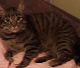 Harmaa raidallinen kissa, pieni, aika arka, 6 vuo…