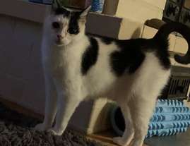 Valkoinen kissa, ruskeat täplät, karkasi narun ka…