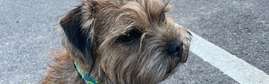 Nuuksio. Borderterrieri uros karkuteillä. Päällä valjaat ja panta ja nahkaremmi. On ystävällinen vaikka haukkuu muille koirille.