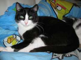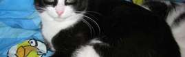Velaatassa kadonnut musta-valkoinen leikattu poikakissa, naamassa, rinnassa, vatsan alla ja jaloissa valkoista. Erityistuntomerkkinä pitää häntäänsä vinossa. Löytäjälle palkkio.
