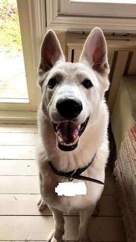 Korialla lähtenyt pihalta omille teilleen sekarotuinen koira (sakemanni/Valkoinen paimenkoira)