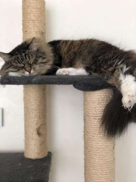 Ruskea musta väritys, kaula valkoinen, samoin tassuissa valkoista. Leikattu 5-vuotias poikakissa. Karkumatkalla Kannonkosken Piispalassa 28.6 lähtien.