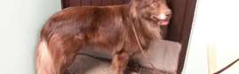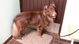 Ruskea pitkäkarvainen sekarotuinen uroskoira talt…