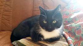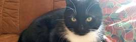 Kadonnut leikattu poikakissa. Musta, valkoista kuonossa, rinnassa, mahassa ja tassuissa. Näyttää Latz-kissalta.