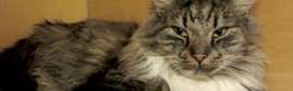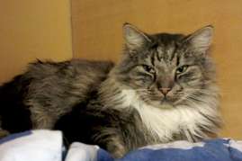 Talteenotettu harmaa kissa, valkoisin merkein. Porin löytöeläin-