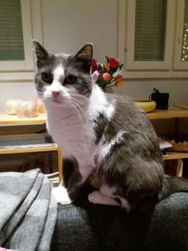 Harmaa-valkoinen äärimmäisen kiltti leikattu tyttökissa. Ei ole ulkoillut vuoteen joten kaikki havainnot tärkeitä
