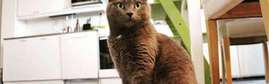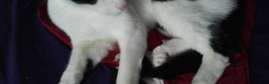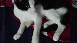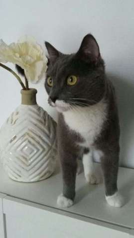 Musta-valkoinen leikattu poikakissa pudonnut 5. kerroksen parvekkeelta. Päältä musta, alapuoli ja silmienväli valkoinen.