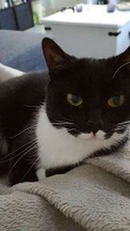 Valko-musta leikattu kollikissa karannut valjaista pelästyessään ja kadonnut. Kissalla selässä kolme mustaa täplää.