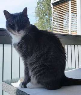 Löydetty Hollolasta Pihkatieltä nälkiintyneenä ja kylmissään marraskuun alussa. Antaa silittää ja koskea, mutta on vähän arka. Liikkunut muutamia viikkoja tällä alueella ennen talteenottoa.