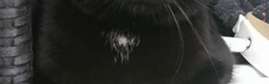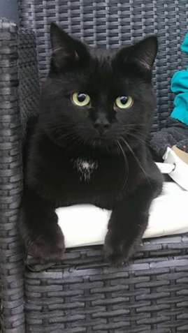uroskissa, vajaan vuoden ikäinen ja muutoin musta mutta rinnassa valkoista ja vähän mahassa.