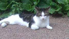 Musta valkoinen kissa jolla rinta valkoinen ja tassut valkoiset