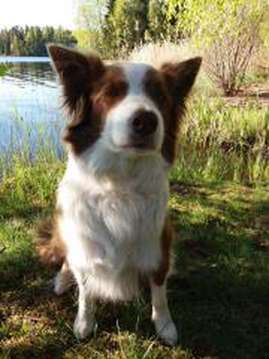 Ruskea valkoinen bordercollie pelästyi lauantai aamuna ralleja. Koira arka eikä kannata koittaa ottaa kiinni.