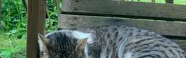 Siltamäki, pitkäkarvainen harmaavalkoinen kissa. Lähestyy kiltisti ihmisiä ja viihtyy pihapiirissä.