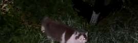 Harmaa valkoinen hännätön kissa pyörii Ritalantiellä iltaisin. Kissa vaikuttaa nälkäiseltä.