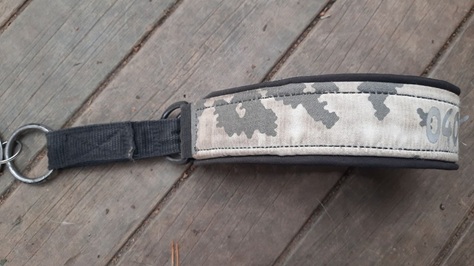 V: Ainakin toisella oli kaulapanta. Jos en väärin muista niin se oli minun itse tekemäni pinkki, puolikuristava ja leveä. Sellainen heijastava. Panta on joku 5 5-6 cm leveä.