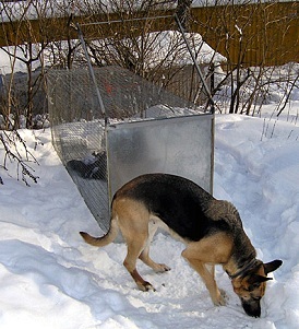 Ruokaa on siis myös loukun ulkopuolella, jotta arka koira vahingossa kävelisi loukkuun asti ruokavanaa seuraten. Kun koira on uskaltanut syödä loukustakin, viritetään loukku.