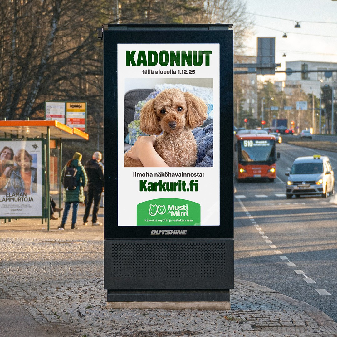 Jos siis etsit lemmikkiäsi, tee ilmoitus karkurit.fi:hin. Mikäli lähialueellasi on ulkomainosnäyttöjä, lisäämme niihin ilmoituksen karkurit.fi:hin antamiesi tietojen perusteella. Kokeilemme Karkurivahtia tulevien kuukausien ajan, jonka jälkeen selviää jääkö palvelu pysyväksi.