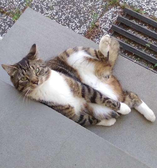 Lappeenranta, Ylämaa. Harmaaraidallinen, leikattu, pienikokoinen, aikuinen kollikissa. Oikean etukäpälän takana valkoinen juova tassusta mahaan. Pikkuisen kyömynenä.