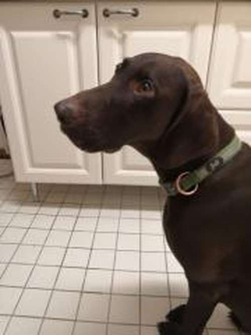 Ruskea iso koira Mikkelintieltä Savitaipaleen liittymän kohdilta n. klo 22:00. Kiltti luonteinen. Lyhytkarvainen. Lintukoiratyyppinen. Vihreä panta.