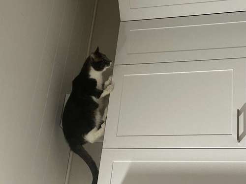 Mustavalkoinen urospuolinen kissa. Kissalla on valkoinen hännän kärki.