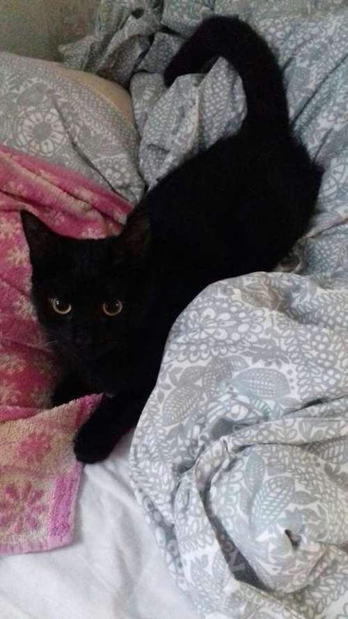 Kadonnut täysin musta tyttökissa, keltaiset silmät. Hoikka, kiiltäväturkkinen
