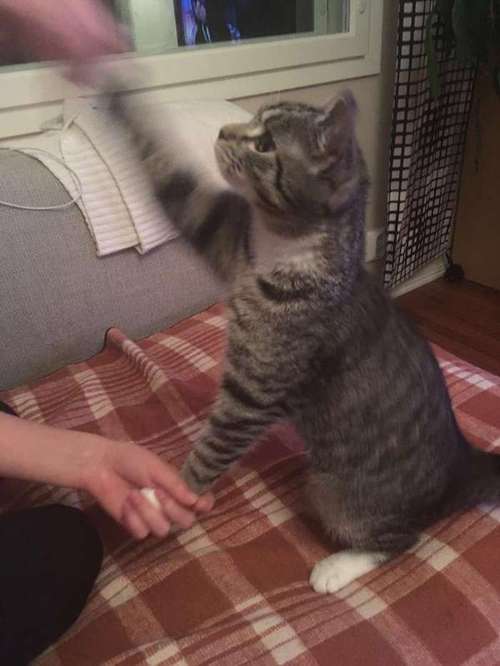 10 kuukautinen leikattu maatiaskollikissa, väriltään harmaa - tassut valkoiset.
