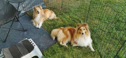 Kadonnut Korpilahdella aidatulla kotipihalta soopeli shetlanninlammaskoira narttu. Kuvassa oikeanpuoleinen. Valkoinen kokokaulus ja valkoinen piirto kuonossa.