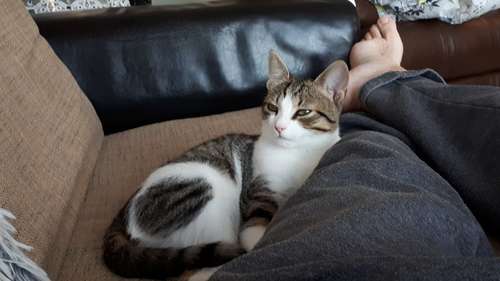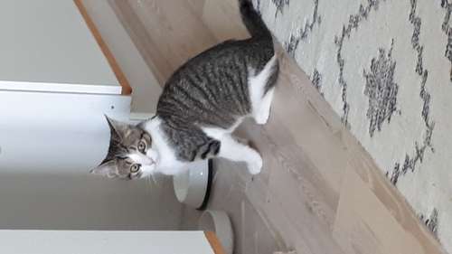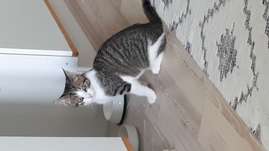 Kuokkalan Ainolanrannassa kadonnut ruskearaitainen, mahan alta ja jaloista valkoinen 6 kk ikäinen poikakissa.