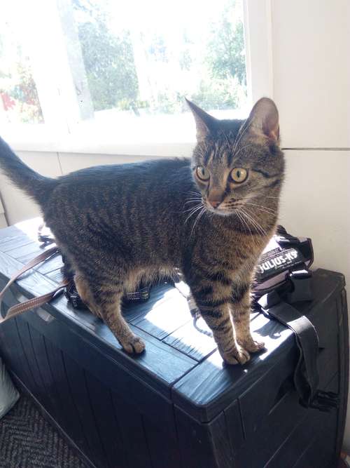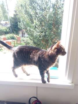Harmaa mustilla raidoilla oleva naaras kissa. Kadonnut Kortemäen kaupungin osasta.