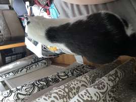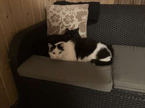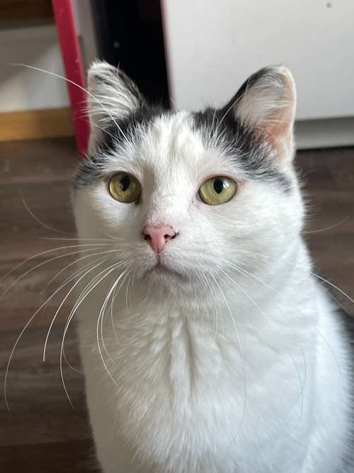Iso, mustavalkoinen leikattu kollikissa karannut ke aamuna Laukaan Vihtavuoressa.