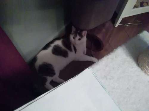 Valkoinen, selässä ja kyljissä tumman harmaita täpliä/läikkiä, myös häntä tumma. Erittäin arka narttukissa.