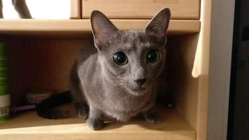 Harmaa, lyhytkarvainen, pienikokoinen kissa. Vihreät silmät.