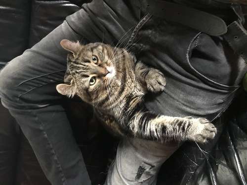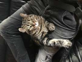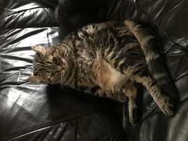 Kadonnut ruskeankirjava tabby-kuvioinen kissa. Kissa on pienikokoinen mutta lihava, erikoisilla korvilla.