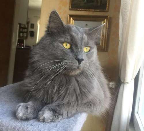Arka sisäkissa (karkasi ikkunasta). Kaipaisimme näköhavaintoja. Kissalla on pitkä harmaa turkki.