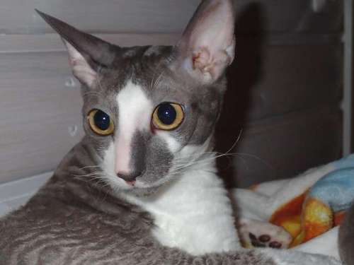 Harmaa-valkoinen 2 vuotias, pieni, pennun näköinen.