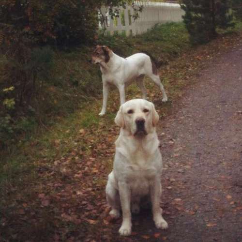 Karannut 1 vaalea labradorinnoutaja ja 1 sekarotuinen vaalea, ruskeilla laikuilla olevat koirat.