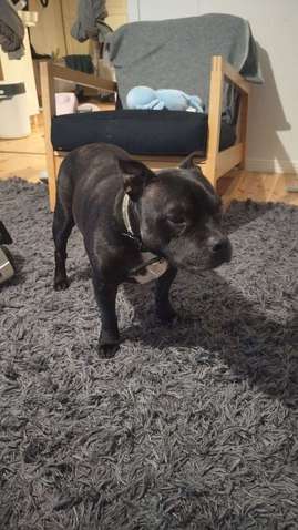Musta staffi karannut pihasta Tampereen Messukylässä. Koira on kiltti ihmisille ja todennäköisesti antaa lähestyä. Luultavasti paniikissa. Isoja koiria kohtaan voi olla aggressiivinen.